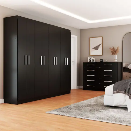 Quarto de Casal Ele e Ela Guarda-Roupa 8 Portas e 8 Prateleiras Cômoda 10 Gavetas Preto – Panorama Móveis